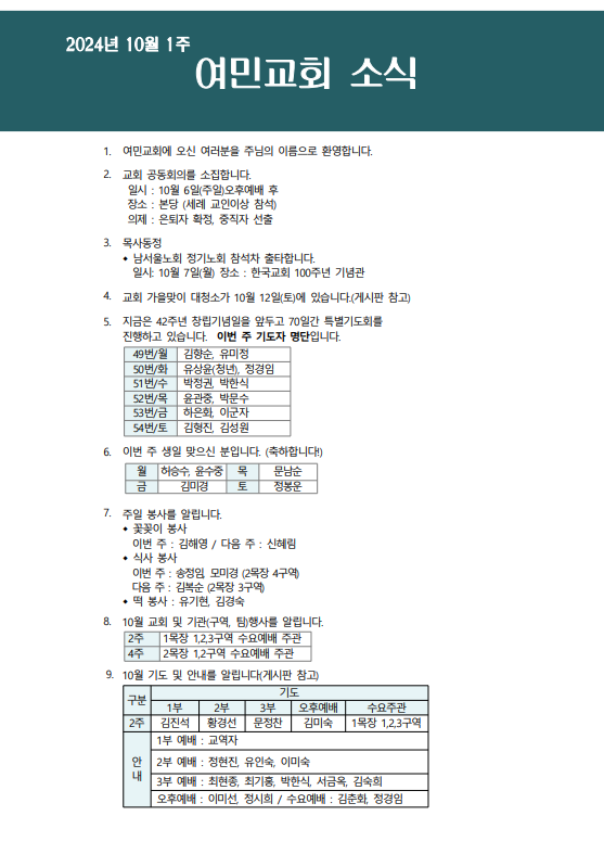 | 이전글 | 교회소식(10월 2주) | 윤미경 | 2024.10.15 | 0 | 123 |