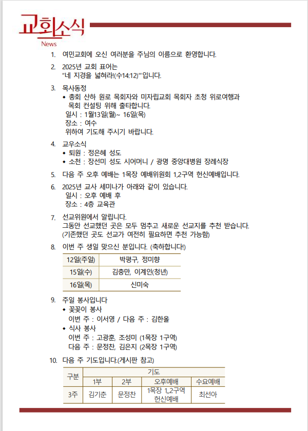 | 다음글 | 교회소식(2025년 1월 1주) | 윤미경 | 2025.01.10 | 0 | 123 |