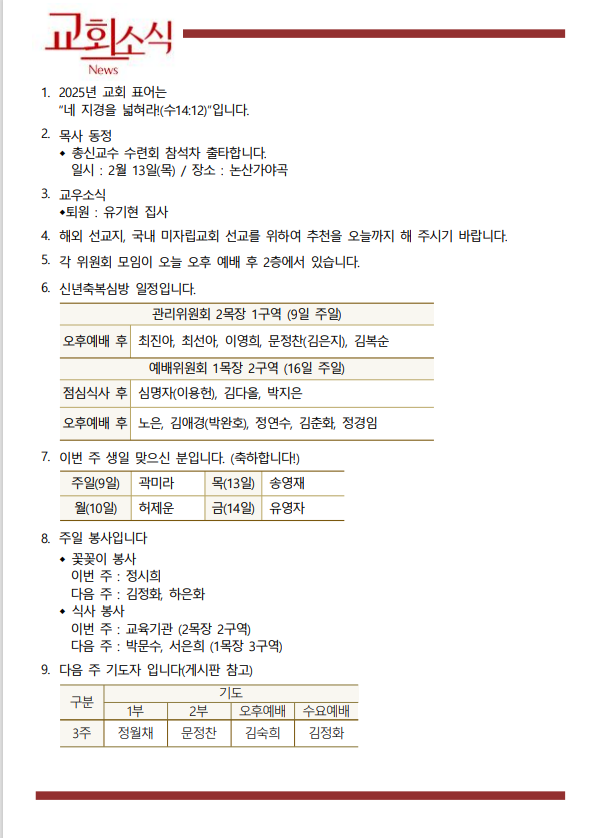 | 다음글 | 교회소식(2월 1주) | 윤미경 | 2025.02.06 | 0 | 120 |