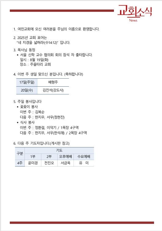 이전글 | 교회소식(8월 4주) | 윤미경 | 2025.08.24 | 0 | 46 |