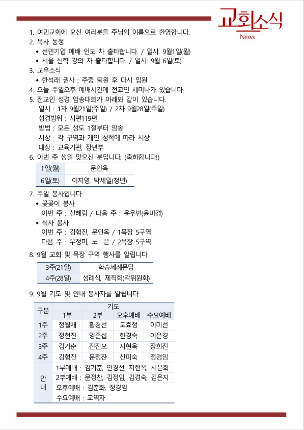 이전글 | 교회소식 (9월 1주) | 윤미경 | 2025.09.09 | 0 | 40 |