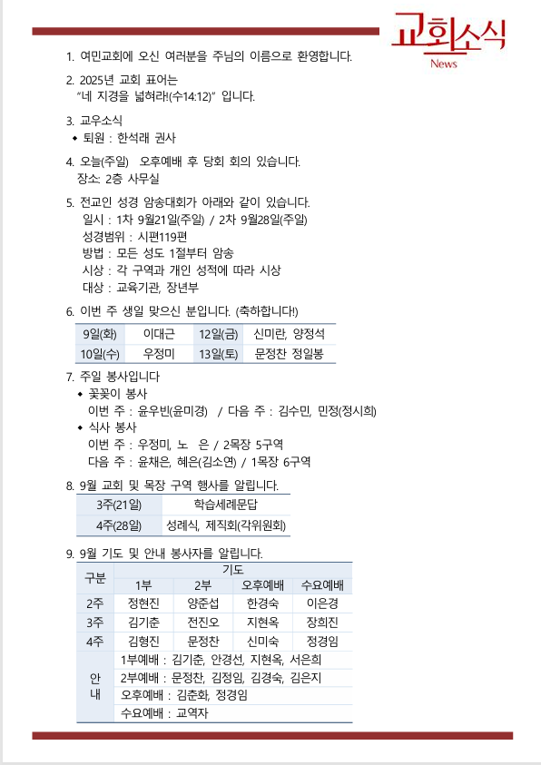이전글 | 교회소식 (9월 2주) | 윤미경 | 2025.09.14 | 0 | 43 |