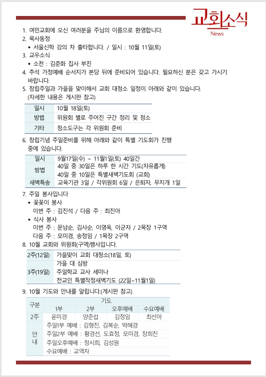 다음글 | 교회소식(9월 4주) | 윤미경 | 2025.09.28 | 0 | 57 |