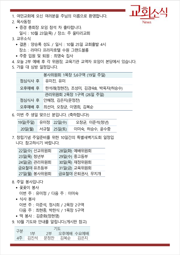교회소식(10월 3주) 윤미경 2025-10-18 추천 0 댓글 0 조회 7 http://yeomin.onmam.co.kr/bbs/bbsView/81/6570713 첨부파일 (0) 0