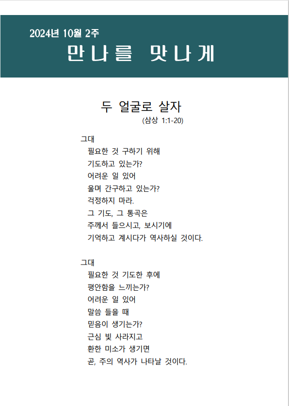 | 다음글 | 만나를 맛나게(10월 1주) | 윤미경 | 2024.10.15 | 0 | 121 |