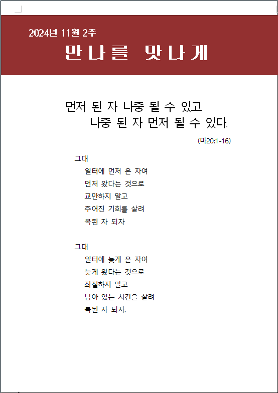 | 다음글 | 만나를 맛나게(11월 1주) | 윤미경 | 2024.11.05 | 0 | 105 |