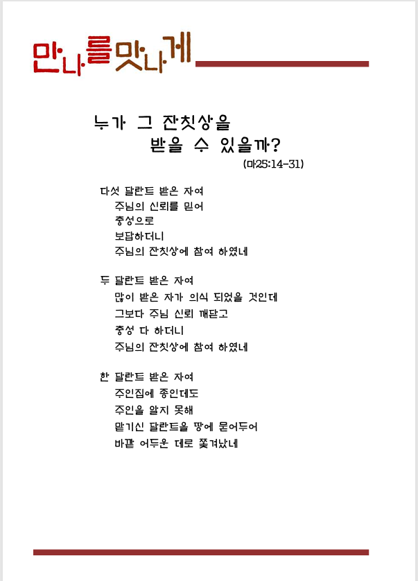 이전글 | 만나를 맛나게(10월 3주) | 윤미경 | 2025.10.18 | 0 | 1 |