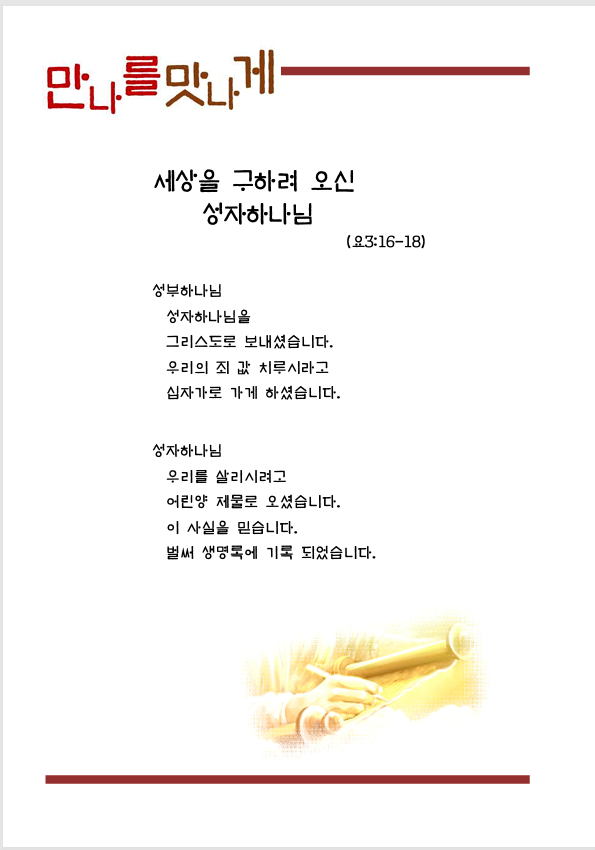 | 이전글 | 만나를 맛나게(12월 4주) | 윤미경 | 2025.12.29 | 0 | 38 |